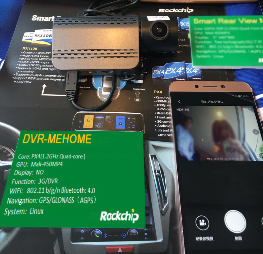 Rockchip高階PX4車聯(lián)網(wǎng)方案,四核處理器,Mali-450GPU,助力車聯(lián)網(wǎng)產(chǎn)品全面升級。本次展出了搭載PX4方案的行車記錄儀,基于Linux系統(tǒng),支持前后1080P+720P雙錄、網(wǎng)絡在線直播、Wifi無線透傳,時延200ms內(nèi)、BT4.0抓拍按鍵、GPS軌跡追蹤、優(yōu)秀的功耗控制;可通過手機APP觀看實時或錄制影像。