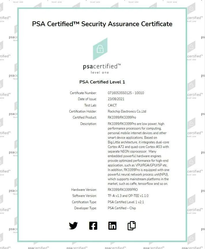 此前,RK3399Pro和RK3399已通過由Arm倡議發(fā)起、專為物聯(lián)網(wǎng)設(shè)備構(gòu)建的安全框架PSA Certified Level 1安全認(rèn)證,支持基于PSA Certified框架的IoT物聯(lián)網(wǎng)及邊緣計(jì)算解決方案高效部署,提升設(shè)備的數(shù)據(jù)安全性及可靠性。