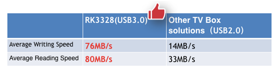 At present, most TV box solutions in the market basically apply USB2.0 interface. Against the backdrop of Internet and IoT with the huge improvements of industrial applications and consumption market, 4K 60Hz UHD videos will become the mainstream demand while USB2.0 is even powerless for the 1080P 30Hz data collection and cannot meet the ever-changing market needs. However, Rockchip RK3328 solution, that supports USB3.0 and Giga ethernet with significant enhancement of speed, provides the hardware guarantee for the real-time transmission of UHD 4K videos.